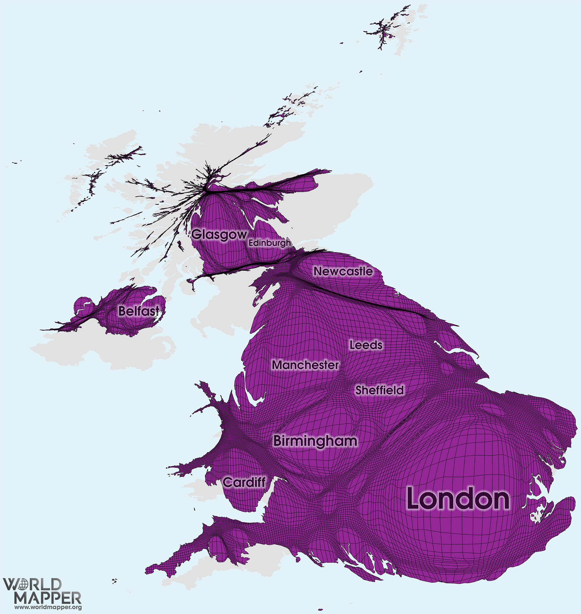 This map is a so-called gridded population cartogram. This cartographic technique was developed by Benjamin Hennig building on Gastner/Newman’s density-equalising cartogram algorithm. A gridded population cartogram can be seen as being an equal-population projection where each area is proportional to the number of people living there.